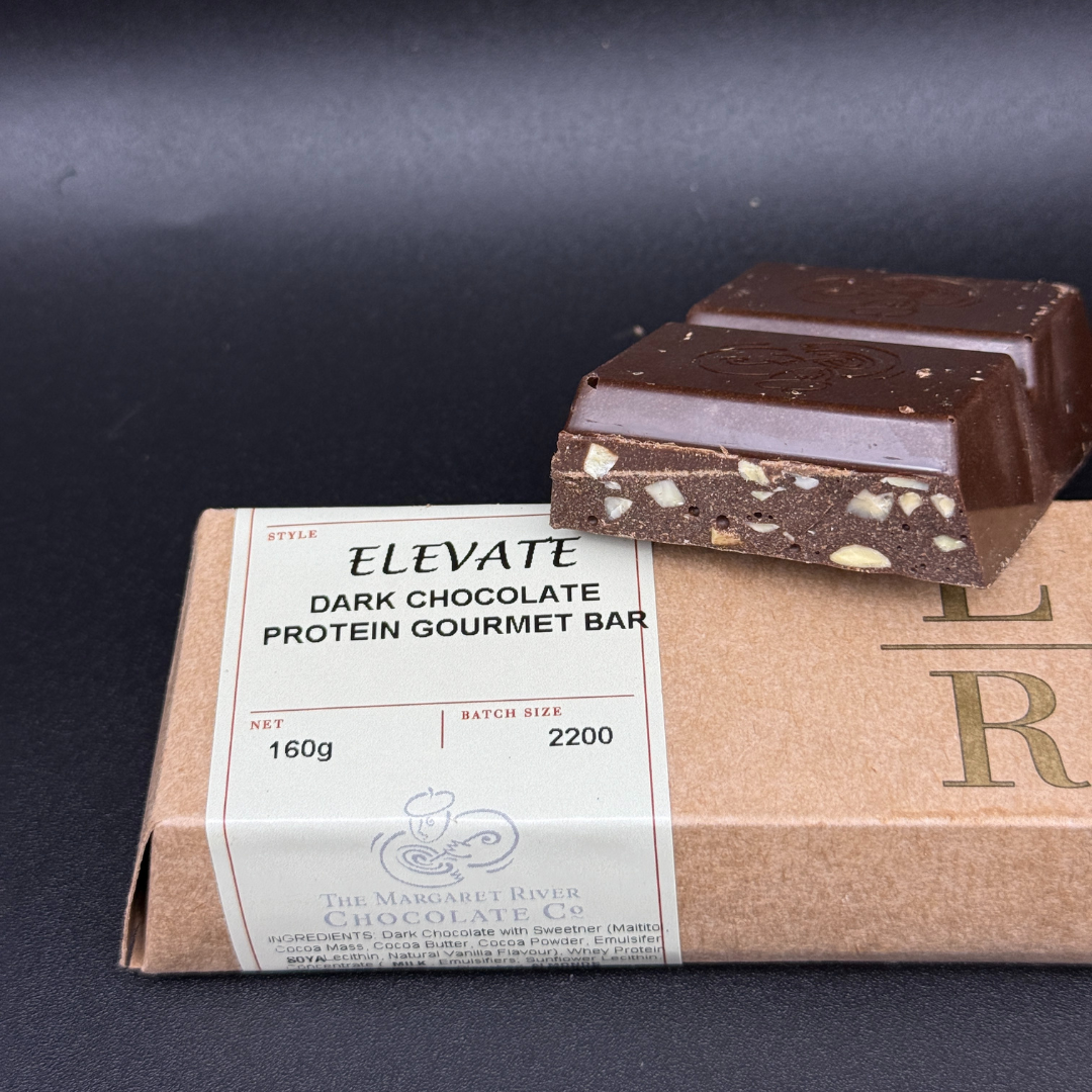 Indulge smarter with our Elevate Dark Protein Bar, crafted for those who want the richness of gourmet dark chocolate with the added benefit of protein – and none of the added sugar.